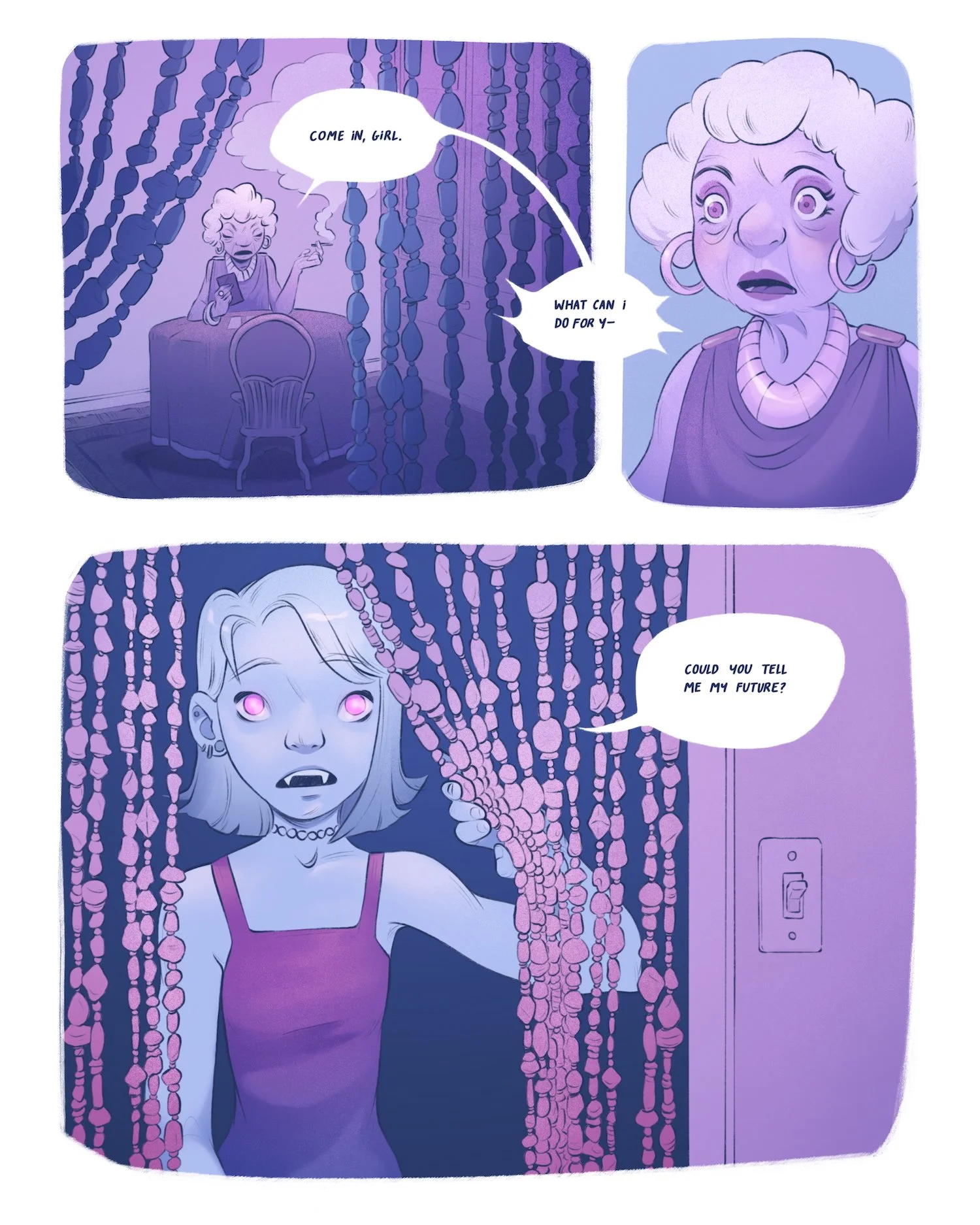 Ever Young is an ongoing comic series about a teen vampire, Phoebe, and a cranky old psychic, Ms. Coco. Episodes are available through my Substack, Stray Scribbles.